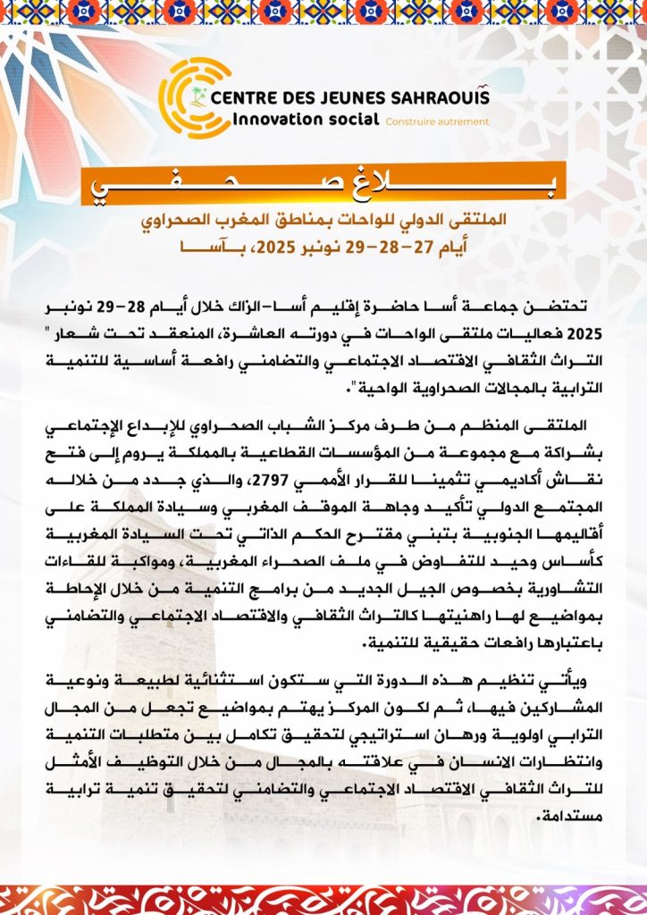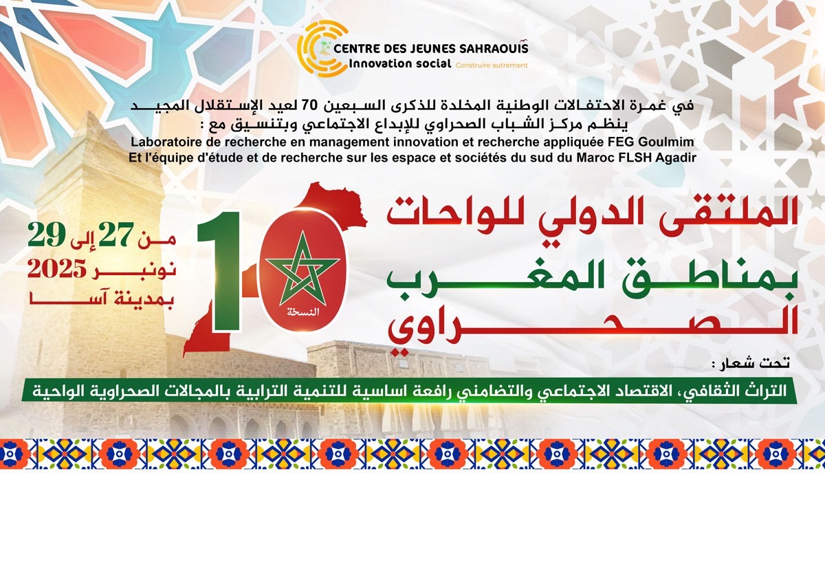 تحتضن جماعة أسا حاضرة إقليم أسا-الزاك خلال أيام 28-29 نونبر 2025 فعاليات ملتقى الواحات في دورته العاشرة، المنعقد تحت شعار ” التراث الثقافي الاقتصاد الاجتماعي والتضامني رافعة أساسية للتنمية الترابية بالمجالات الصحراوية الواحية”.