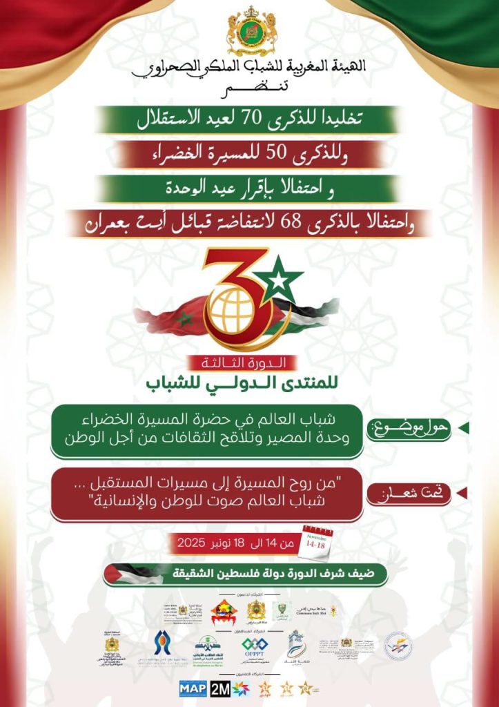 تنظم الهيئة المغربية للشباب الملكي الصحراوي بشركة مع مجلس جهة كلميم واد نون ووزارة الشباب والثقافة والتواصل -قطاع الثقافة- ومجلس جماعة سيدي افني فعاليات الدورة الثالثة للمنتدى الدولي للشباب، بمدينة سيدي إفني، جهة كلميم واد نون، تحت شعار “من روح المسيرة إلى مسيرات المستقبل… شباب العالم صوت للوطن والإنسانية”، وذلك في الفترة الممتدة من 14 إلى 18 نونبر 2025.