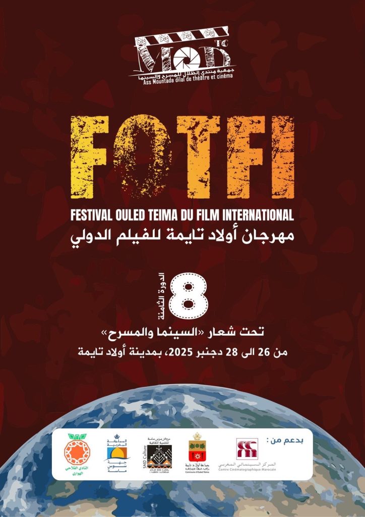 تتشرف جمعية منتدى الظلال للمسرح والسينما بمدينة أولاد تايمة بالإعلان عن تنظيم الدورة الثامنة لمهرجان أولاد تايمة للفيلم الدولي، وذلك خلال الفترة الممتدة من الجمعة 26 دجنبر إلى الأحد 28 دجنبر 2025، بالمركب الثقافي لأولاد تايمة، ابتداءً من الساعة الرابعة مساءً.