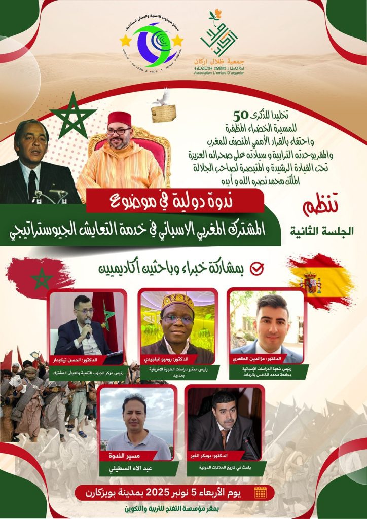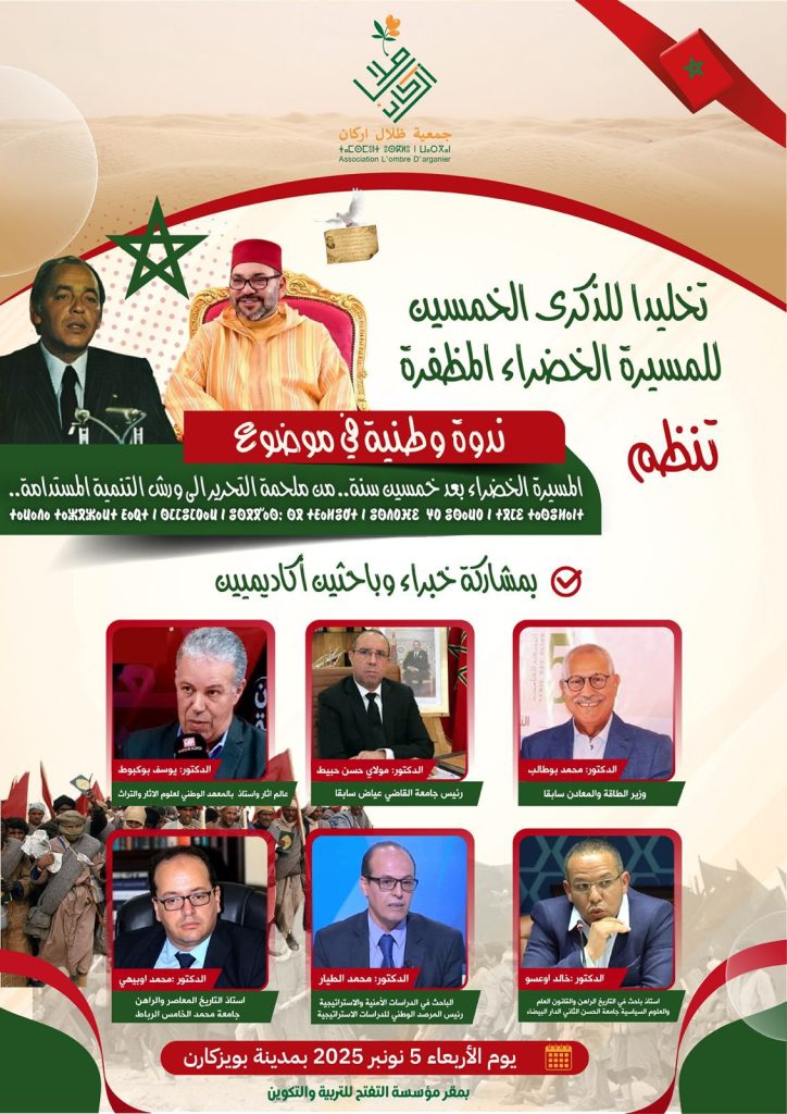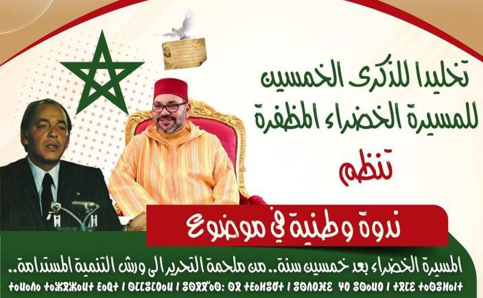 - تخليداً للذكرى الخمسين لانطلاق المسيرة الخضراء المظفرة، تنظم “جمعية ظلال أركان” يوماً علمياً استثنائياً بمدينة بوَيْزاركّان (إقليم كلميم)، يجمع نخبة من الخبراء والأكاديميين والمسؤولين لمناقشة التطورات التاريخية والجيواستراتيجية لقضية الصحراء المغربية.